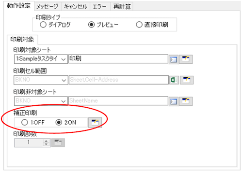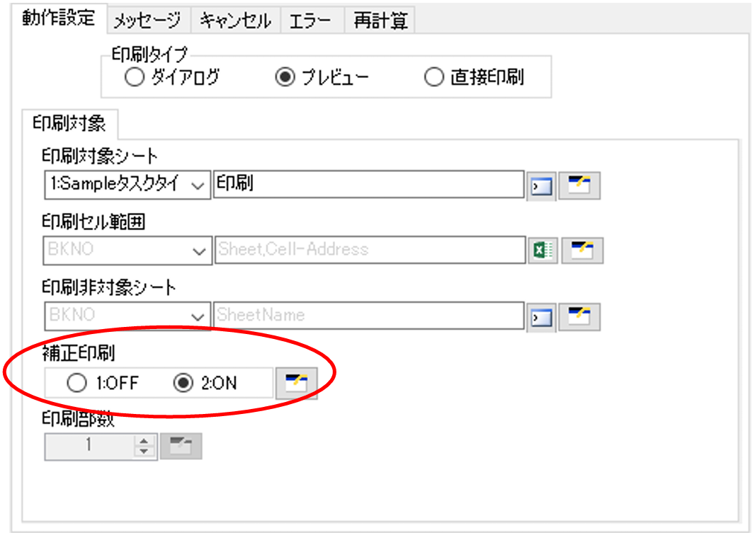 タスクタイプ[61301:印刷]/[動作設定] に「補正印刷」の設定があります。